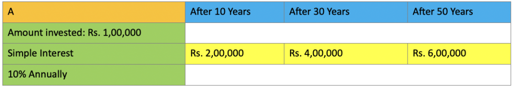 Investor A’s returns are calculated considering the simple interest, while Investor B’s returns are calculated considering the compound interest. It’s clearly visible that compound interest helps us to accumulate much larger amount as compared to the simple interest.