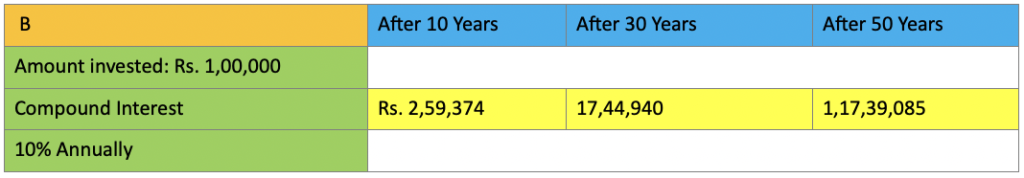 Suppose, there are two investors, A and B, both of them invest Rs. 1,00,000 each. The below table shows what they would accumulate over the years