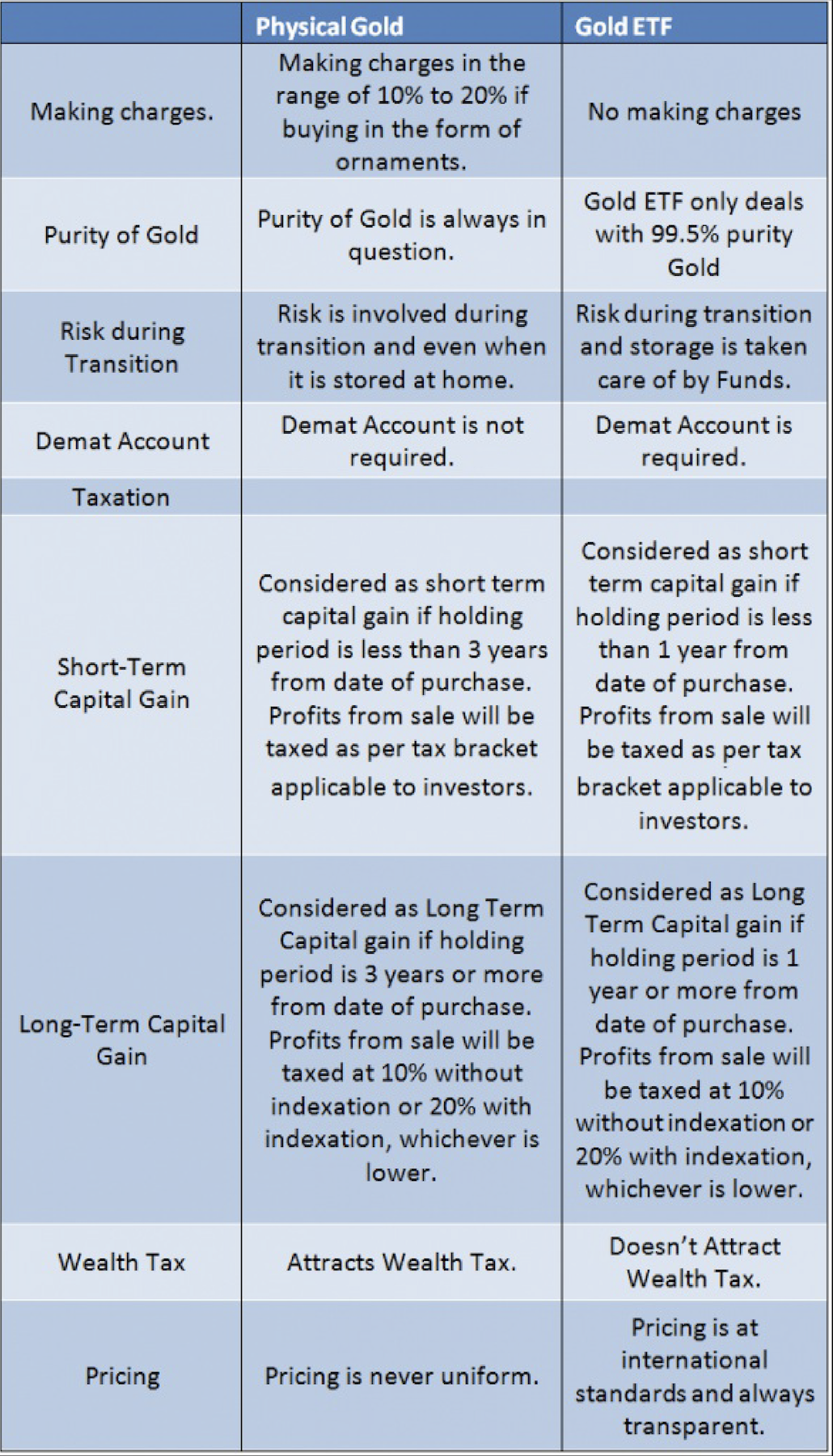 Following table gives a clear comparison between physical Gold and Gold ETF.