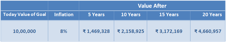First of all investors need to recognize the impact of inflation on their long term goals. Most of the times while planning for their financial goals investors either don’t consider inflation or try to consider it in ad hoc manner which is wrong. When you consider 8% inflation it is compounded 8% p.a. and not simple so your cost will double almost in every 9 years. It has a very slow but significant impact on our Financial Goals. Below chart will show you the value of goal increases at 8% inflation over the years.