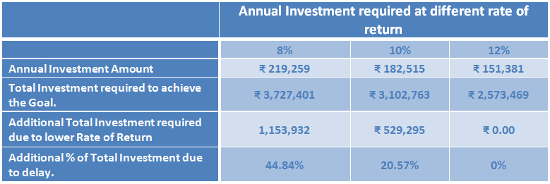 As shown in above chart, at 12% Rate of Return annual investment required is 1.51 lacs and total investment required is 25.73 lacs where as at 10% Rate of Return annual investment required is Rs.1.82 and total investment required to achieve goal is 31.02 lacs. So at 10% Rate of Return on investment , total investment required increases by 5.29 lacs which is 21% higher as compared to investment done at 12% Rate of Return. Similarly in case of investment done at 8% returns annual investment required is Rs. 2.19 lacs and total investment required to achieve the goal is 37.27 lacs. So at 8% Rate of Return one has to invest Rs. 11.53 lacs more to achieve education goal as compared to investment to be done at 12% Rate of Return.