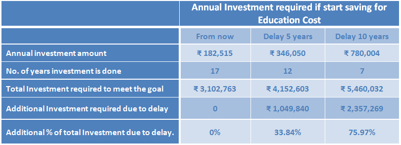 In above table in option A the investor selects to save for the goals from now. So he needs to invest Rs. 1.83 lacs every year for next 17 years and total investment required is Rs.31.02 lacs. Whereas if he starts after 5 years( as shown in Option B) he will have to save for 12 year only but annual investment required to achieve value of Rs. 74 lacs will be 3.46 lacs and total investment required is 41.52 lacs . So delay of 5 years increases the total investment required by around 10.50 lacs (41.52-31.02) which around 33% more than Option A when investment for the goal is started immediately. In C investment starts 10 years late as compared to A and so the annual investment required is 7.80 lacs and total investment required to achieve the goal is 54.60 lacs which is 23 lacs (76%) higher as compared to option A . So the earlier you start better you will be to beat inflation.