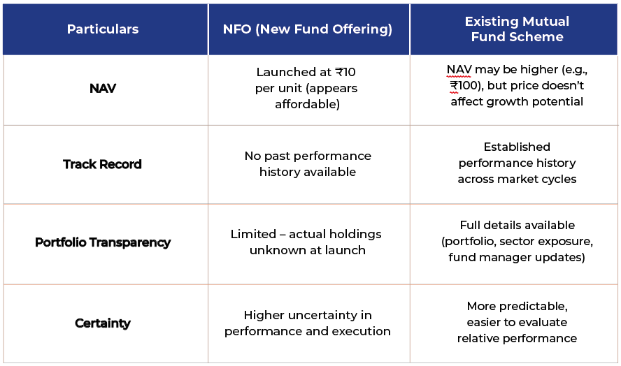 Both NFOs and existing mutual funds have their own strengths. NFOs can be a good option if you're an experienced investor looking to explore new ideas. But for most investors, existing mutual funds are usually the safer and more reliable choice - thanks to their track record, transparency, and flexibility. The key is to choose what fits your goals, risk level, and how much information you’re comfortable with before investing. It is always advisable to consult your financial advisor before making. any investment decision.