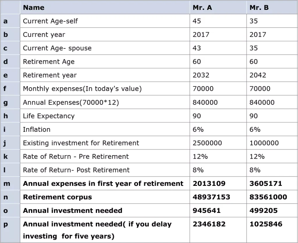 - Delay in Retirement Planning : last figure in cell p shows that if Mr. A & Mr. B both decide to delay their retirement planning decision by further 5 years and want to start providing for retirement after 5 year then what would be the annual investment required to meet the same target retirement corpus at 60. In case of Mr. A the annual investment needed if he starts after 5 years is 23.46 Lakhs which is more than double as compared to figure of 9.45 lakhs if he starts now. And for Mr. B it is Rs. 10.25 Lakhs against Rs. 4.99 lakhs if he starts now. So five years delay can make this goal very difficult.