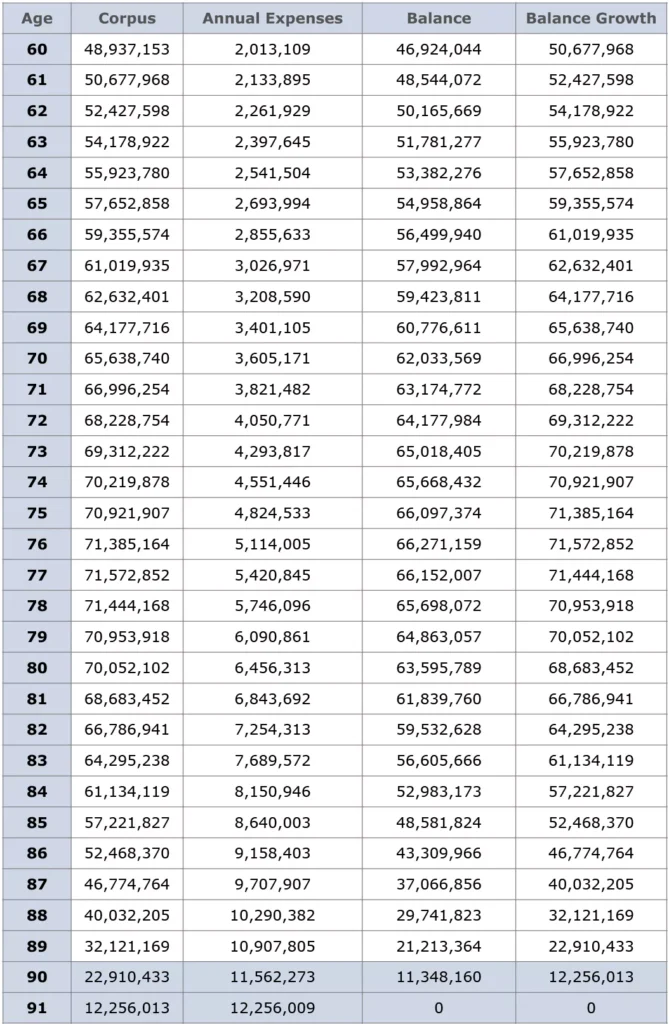 Below is the corpus utilization table for above illustration of Mr. A which shows how annual expenses keep growing even after retirement and how corpus is utilized for the same. At 92 years of age of wife the corpus becomes zero.