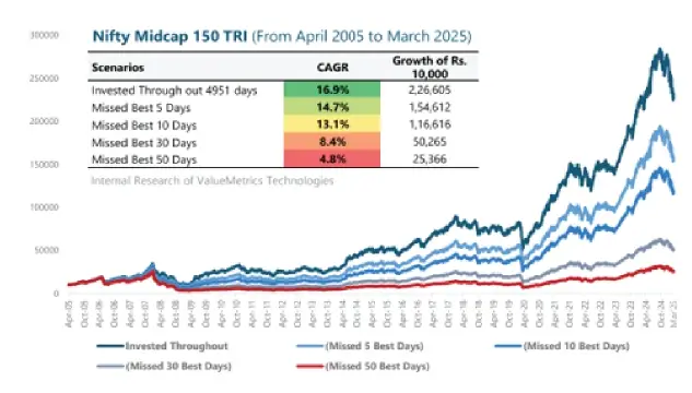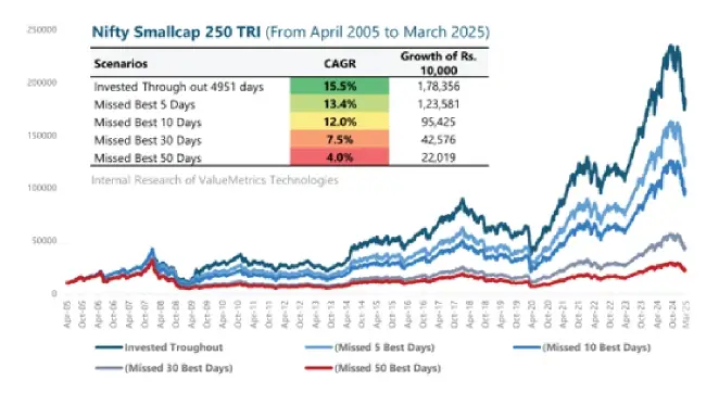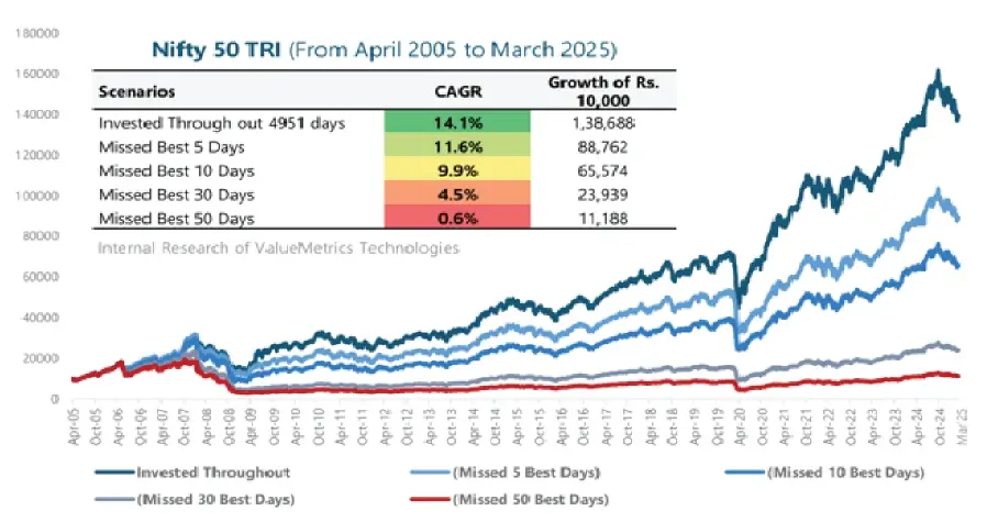 The research looked at how much a small investment of 10,000 would have grown over 20 years-from April 2005 to March 2025āif an investor stayed fully invested in the market versus missing just a few of the best-performing days.