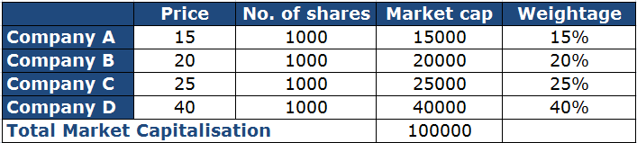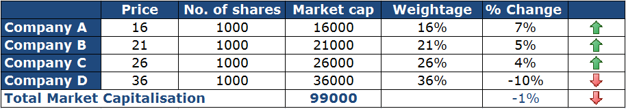 In above chart you can see that all four companies have different prices and have 1000 shares outstanding. So market capitalization (Market Capitalization= Total outstanding shares x market price of the share) is the total market value of the company. Now index will start from 100(Base of the Index is taken at 100). For example as shown in below table 2, on day one prices change as under and prices of company A, B and C goes up but prices of company D falls by 10%. So in totality index falls by 1% and becomes 99 from 100 because impact on total value of market capitalization is -1%.