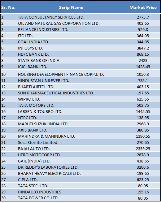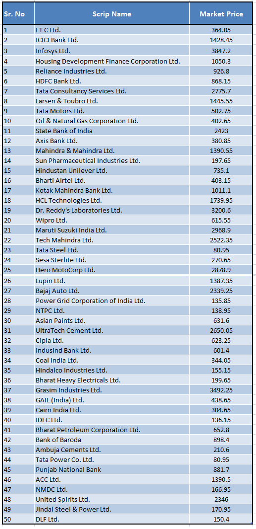 Nifty: Nifty is the Index which represents large 50 companies traded on National Stock Exchange. It also calculated in the same manner and with Free Float Market capitalization. Nifty was started in 1995 with Base value of 1000. Following is the current constitution of Nifty.