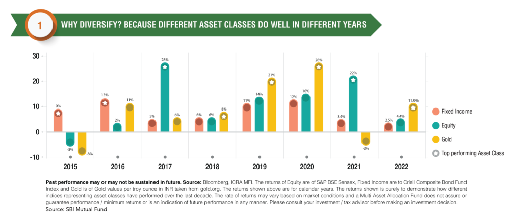 Diversification, which means spreading your investments around, helps reduce the impact of ups and downs in the market. when you invest in a multi-asset fund, you’re essentially getting a ready-made mix of investments without having to research and manage them individually. These funds aim to combine the safety of bonds, the potential growth of stocks, and the stability of gold all in one professionally-managed package. This helps smooth out the ups and downs in your returns and makes investing easier for you.
